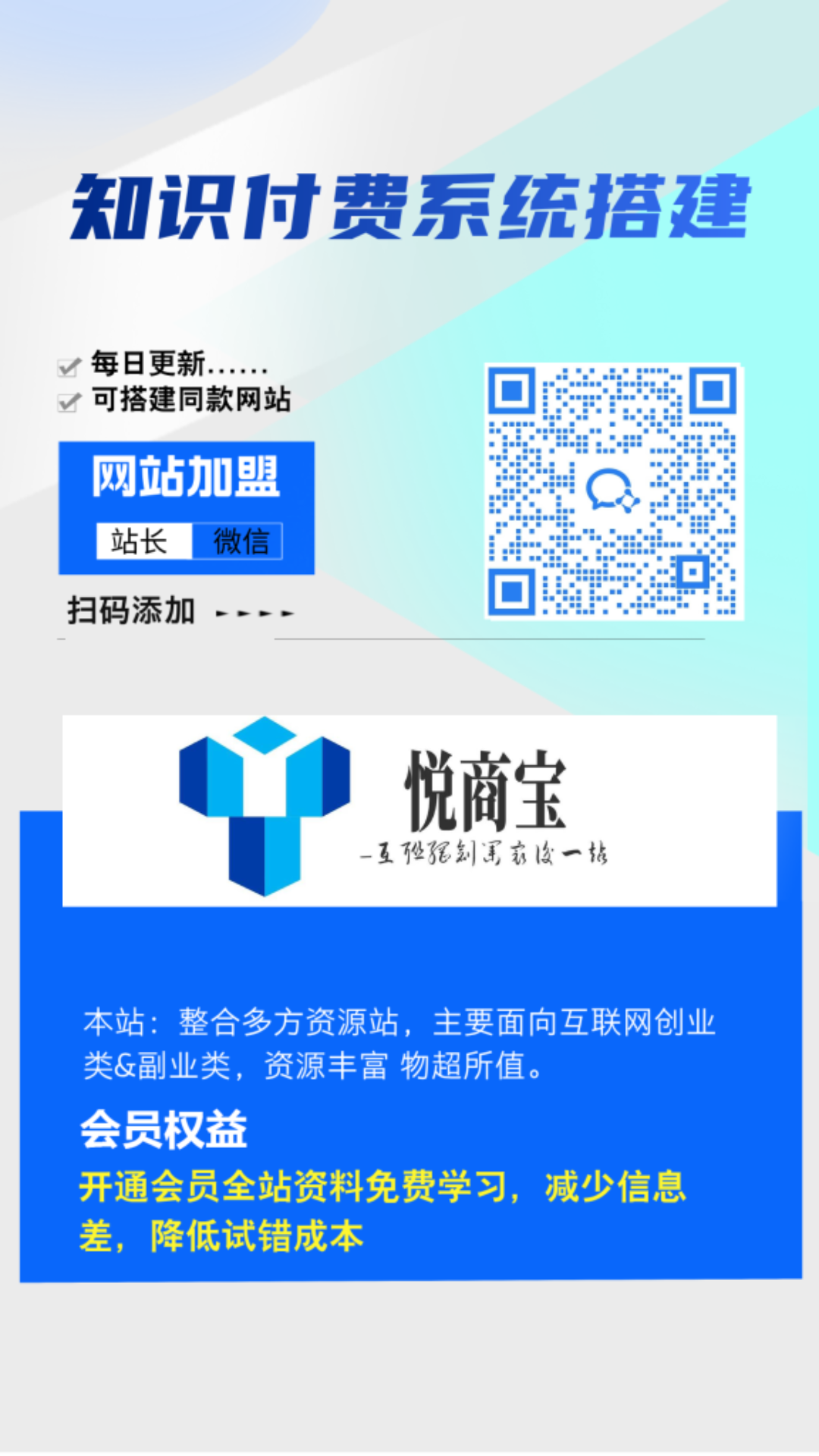 加盟悦商宝,加盟搭建同款知识付费资源网站,实现长期稳定被动收入~
